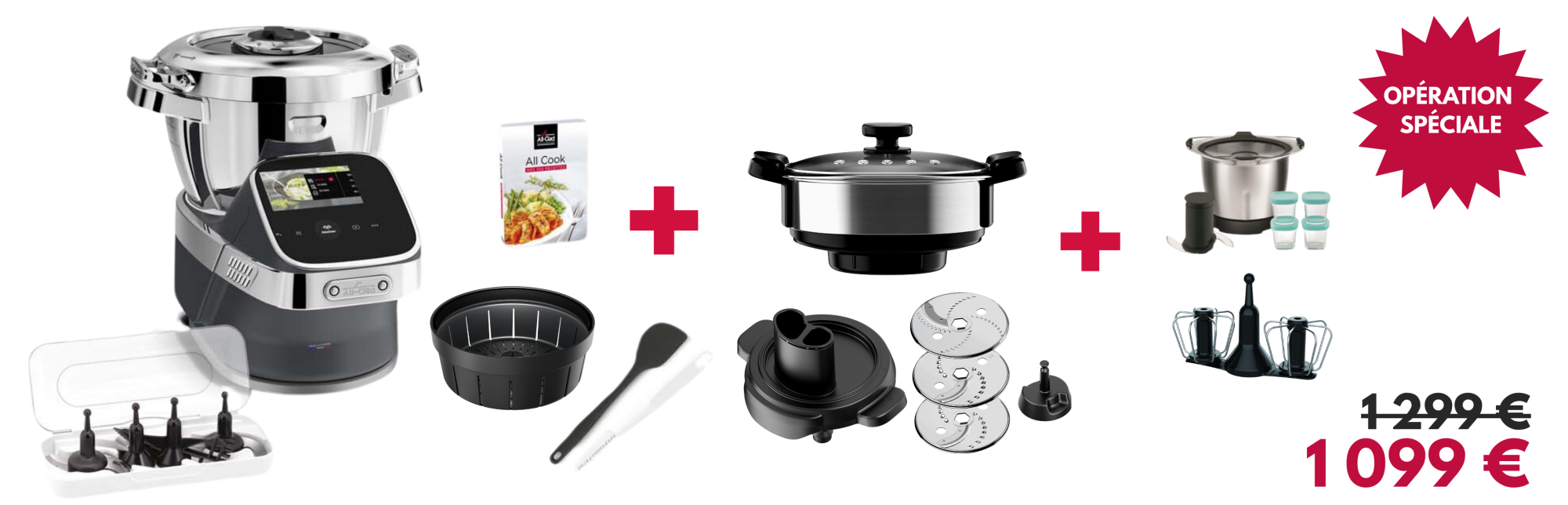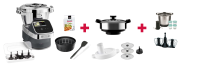 | Accessoires inclus | 4 couteaux et leur boîte de rangement, le panier interne, un cuiseur vapeur avec plateau intermédiaire, accessoire découpe-légumes et ses 3 disque de découpe, un livre de 300 recettes. |